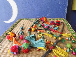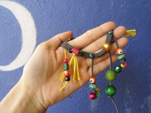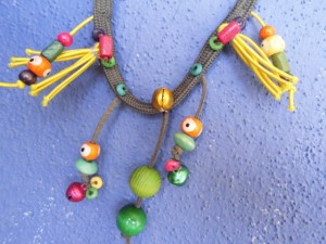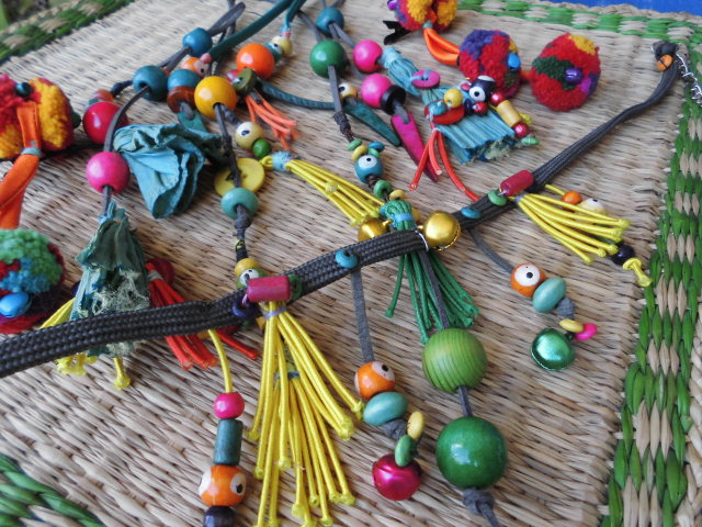 髪飾り、ネックレスなど、日向ぼっこしながら作りました。つなげて結んで縫い合わせて~。