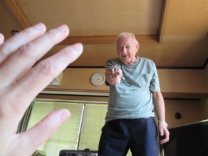 約1時間半の帰り道。無事、豊橋へ到着!家に帰り、荷物の整理に忙しいきみどり家に向かって、木製ピストルを向けるべラ。