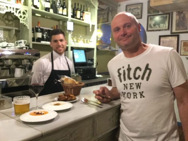 私たちが選んだのは「サルモレホ」「アホ・ブランコ」「なすのフライ」。これがもう、至福の味!(写真十一枚目)。中央の白いスープが「アホ・ブランコ」。アーモンド、にんにく、オリーブオイルで作る、シンプルかつおいしく作るのが難しい一品。