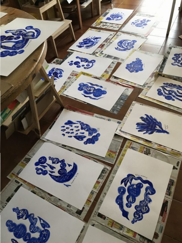 それから、一気に描き出した。ケント紙に向かって、絵の具は青だけ。私は下描きはいっさいしないので、青い筆一本で描いていった。一枚、二枚、三枚・・・