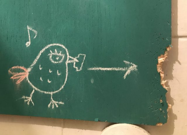 黒板は食いちぎられるし(写真)。せっかく緑色の黒板用えのぐでペイントしたのに。悔しいので、犯人を描いてやった(笑)。