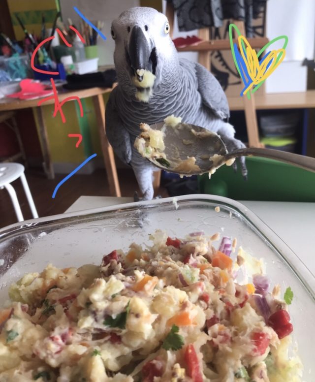 時間を忘れ、座ることも忘れ、夢中になって作っていたらオウムの怒りが爆発。自分のお皿を床へ放り投げマニフェスト。はたと、ランチがまだだったことを思い出す。