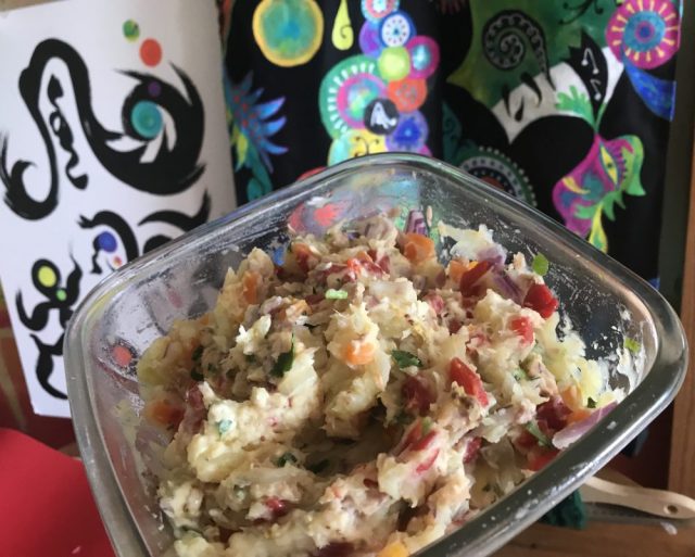 こんなママで。あわててキッチンへ。とりあえず15分で「具だくさんポテトサラダ」を作る。ポテト、人参、紫玉ねぎ、赤ピーマン、ツナ、コリアンダー、ゆで卵。