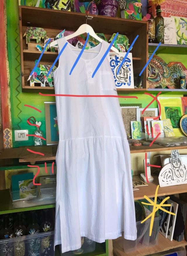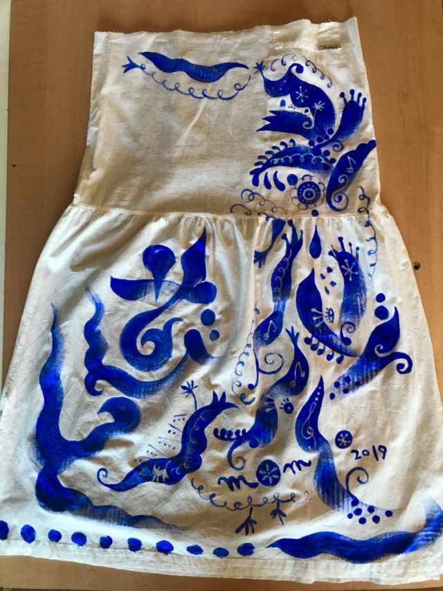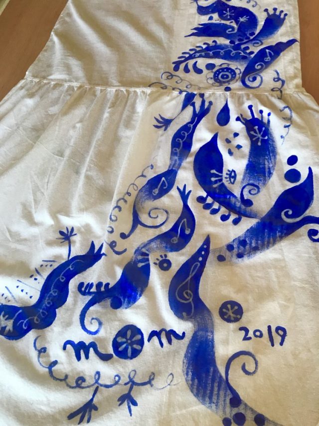古着のワンピースを大胆にカットしてペイント。これからウエスト周りを調節してもらい、スカートに変身!する予定。はたして。