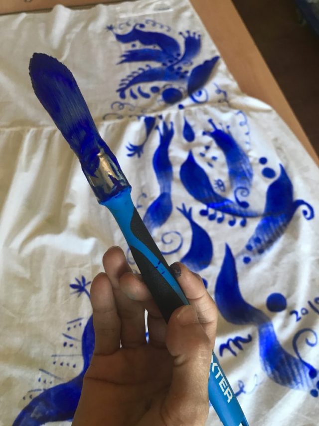 マリンブルー単色でペイント。白い布に藍色が映える。涼しげ。夏らしい〜。白いTシャツと合わせてもいいかも。