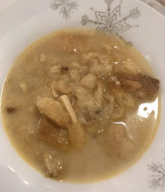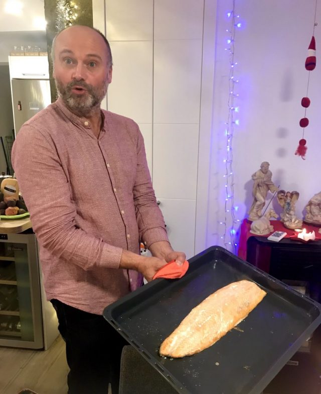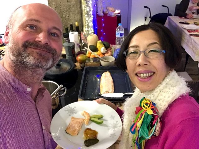 まずはスープ、ハム、チーズでスタート。オーブンではサーモンが出番を待っている。食べながらも、せわしく立ち上がり、テーブルとキッチンを往復するハビ吉。テキパキとメニューを進めていく。
