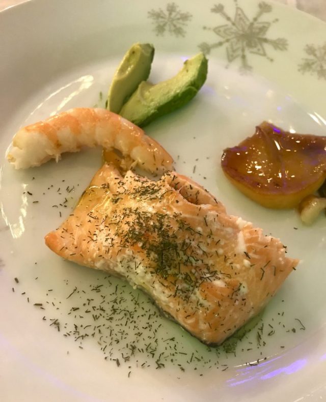 ここで、サーモンが登場。これがめちゃうま。私の作るパサパサのサーモンソテーとは別世界の食べ物。また盛り付けがきれい〜。