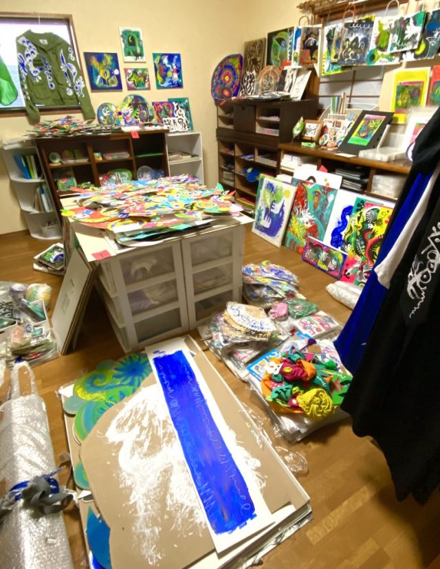 ちなみに、2階の「作品保管室」はこんな感じ(写真)。テーブルも棚も床も。作品でいっぱい。あかんやろ〜(汗)。と思いつつ、そっとドアを閉める。