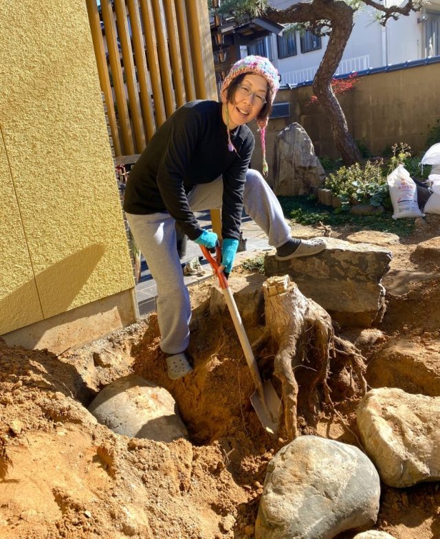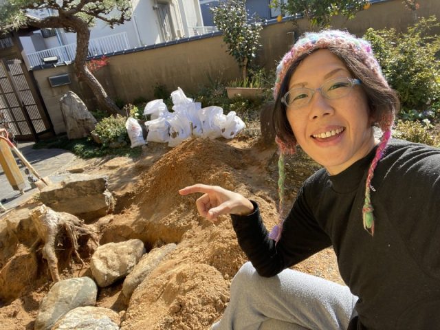 【一日一作プロジェクト】「たのしび」を作った。庭の穴掘りは続く。ようやく開けた大穴に向かって、石を転がし入れる。緊張の一瞬。
