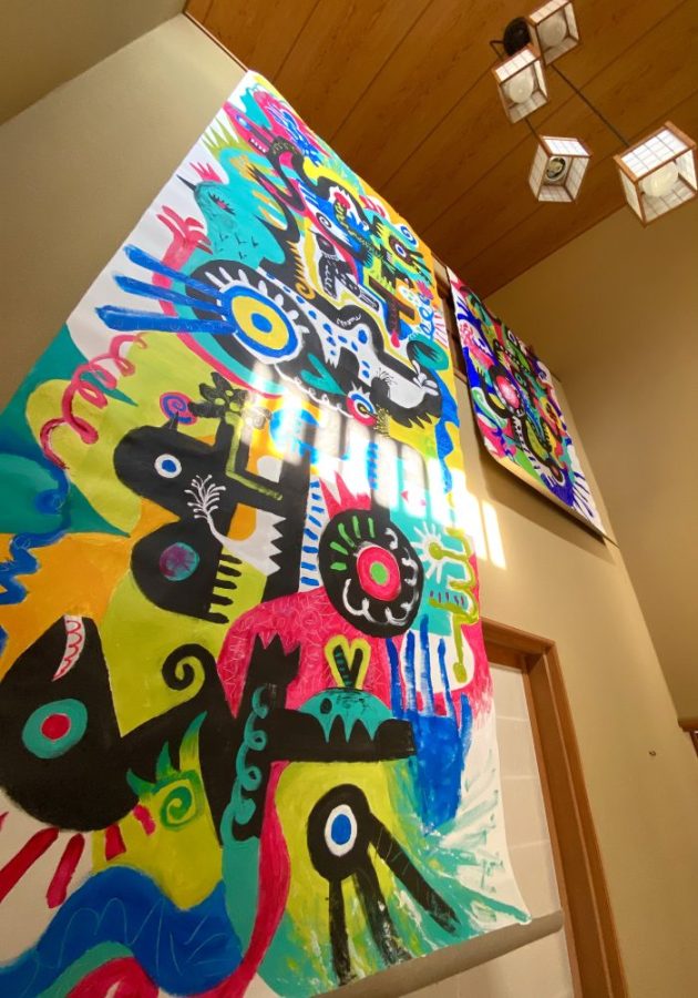 玄関の「吹き抜けスペース」(写真)。父の自慢のお出迎えスペース。2階の手すりから作品を垂らしてみると・・・いやぁ、これが思いがけずいい感じ。まさに