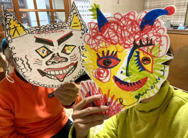 「投げるよー。鬼は外!」「うぎゃあ〜」