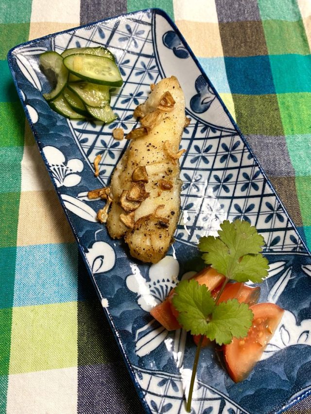 赤ワインで乾杯。タラのニンニクソテー、トマトにはパクチーを乗せて。父は知らないと思うけど