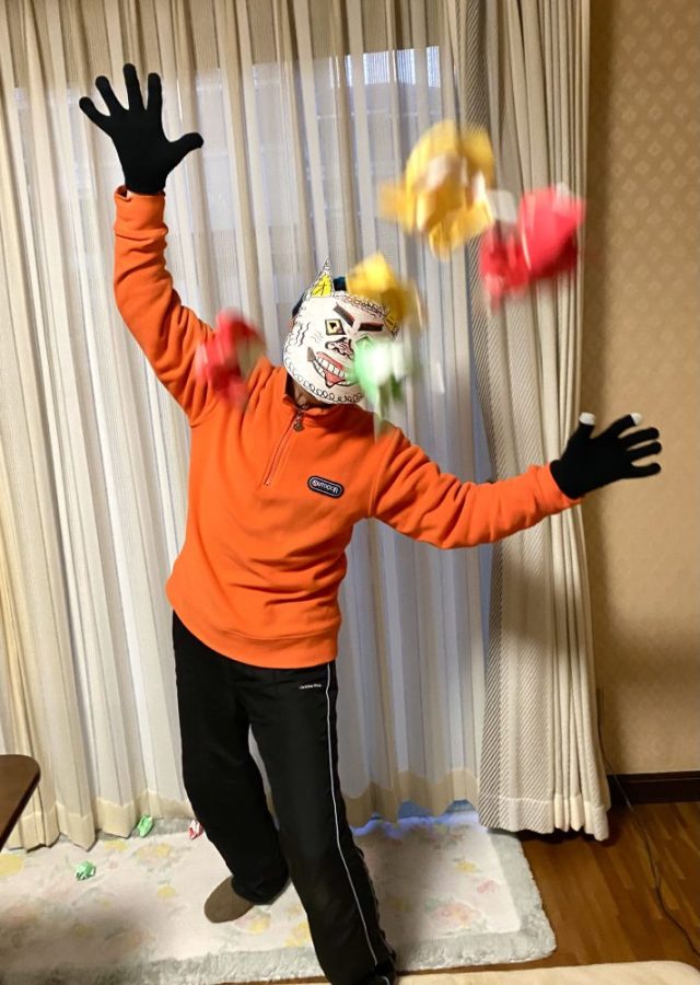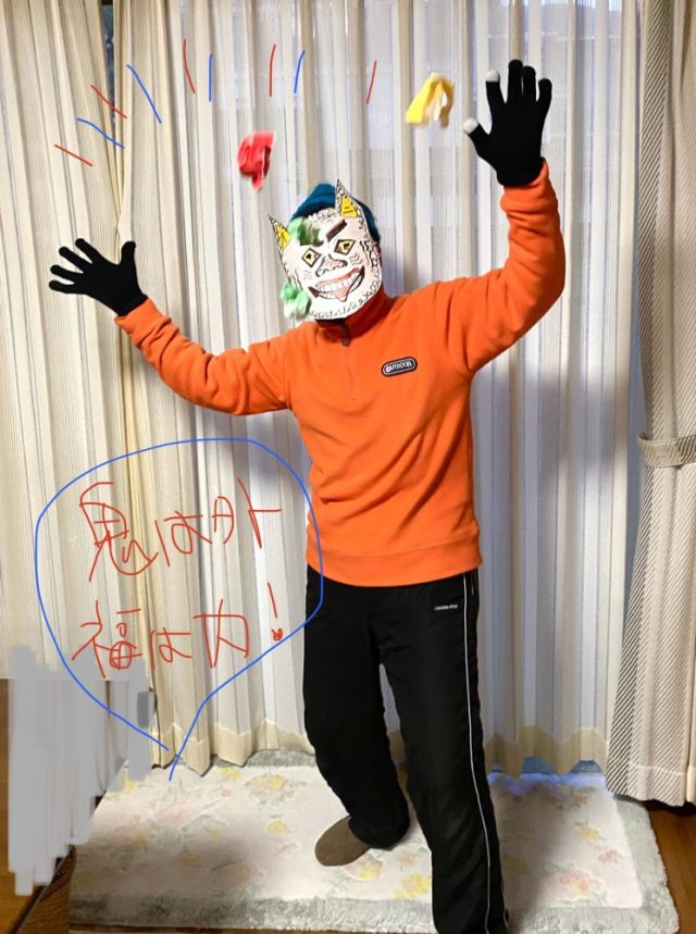 投げる(笑)。「鬼」役も、互いに交代で。本当は玄関で豆まきするはずが、あまりの寒さに「暖かいリビングでやろうよ〜」。気骨のない鬼たちであった。