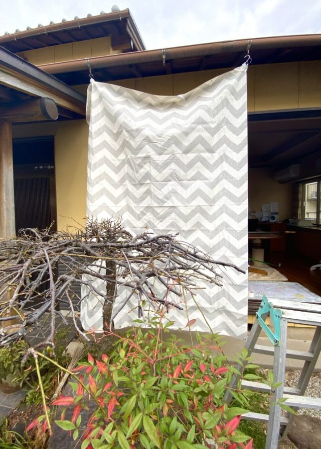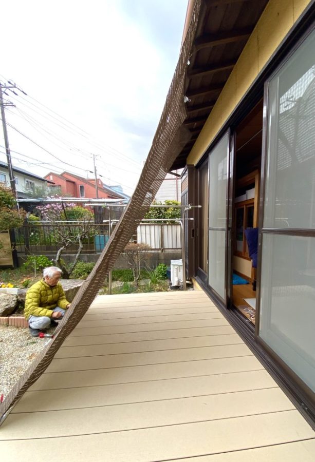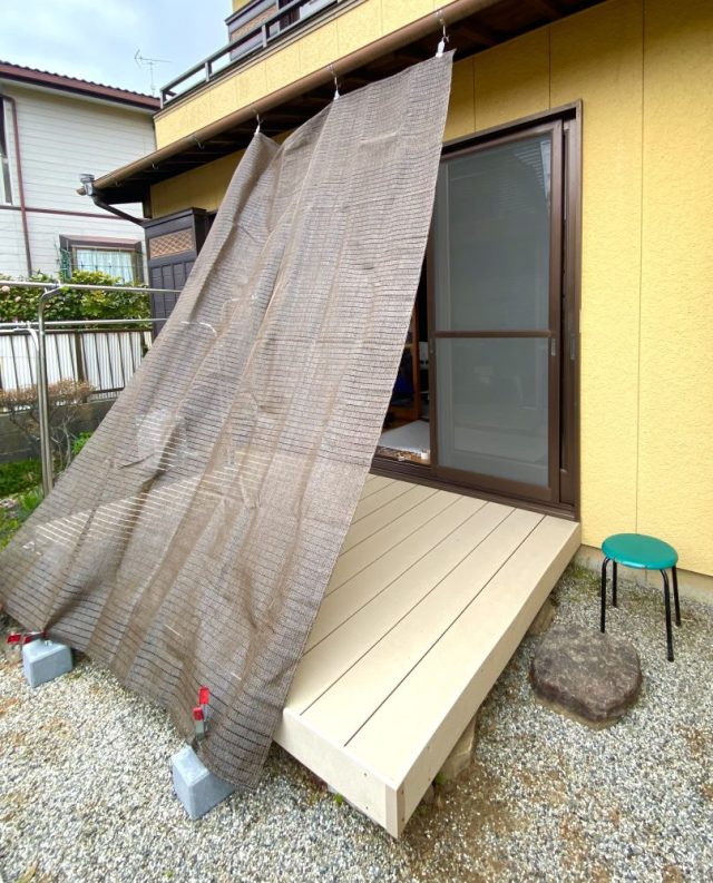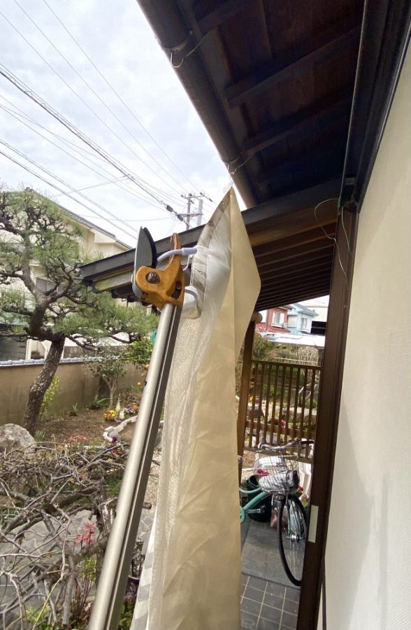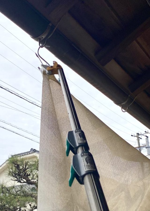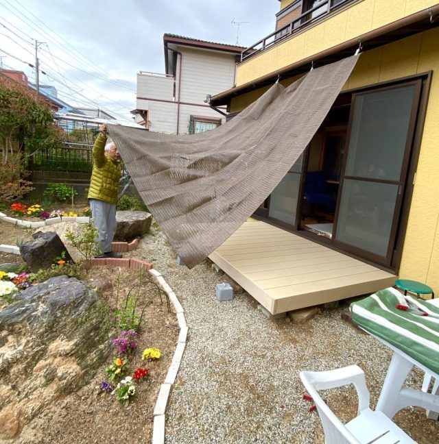 突然の強風や大雨の際に。私がいなくても、ささっと簡単に着脱できる。そうでなければ意味がない。実際、私は「3段の脚立に登って」作業している。こんなこと、父には絶対させられない。