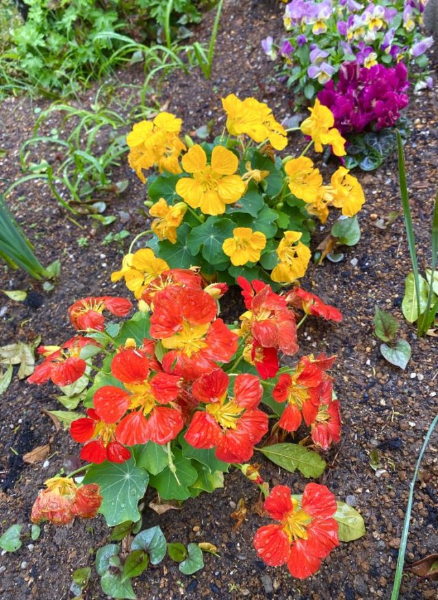 小雨が降っていたけれど、ふらりと庭へ。傘もささずに。濡れるのも楽し。なんと雨に濡れて、生き生きと鮮やかな色を放つ花たち。きれい〜。