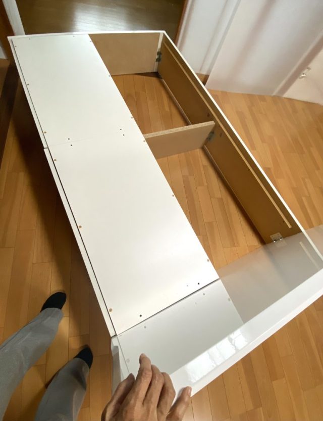 重っ。腰を痛めないようゆっくりと〜。実はこれまで、ベッドの周りは不要な物や家具でいっぱいだった。脚立、板、イス、棚、養生シート、ペンキ・・・