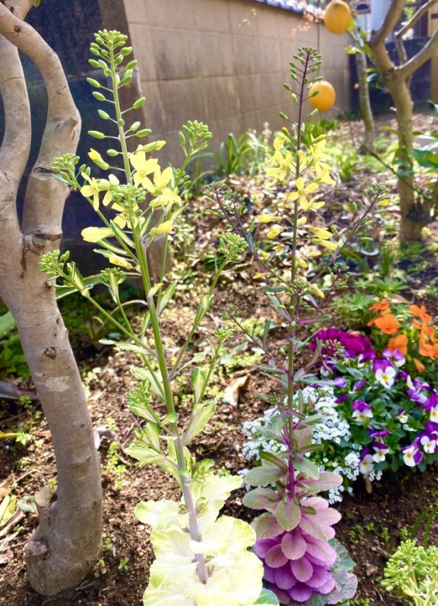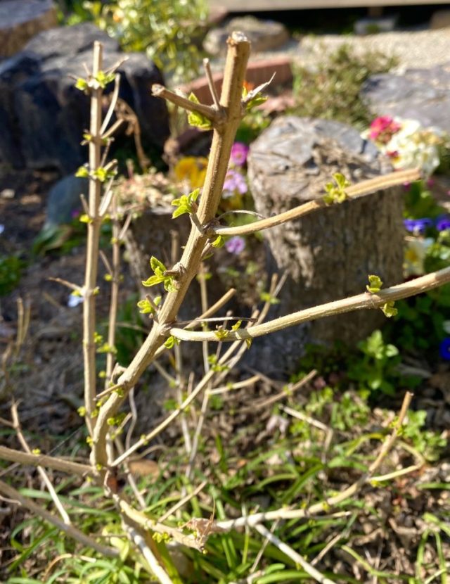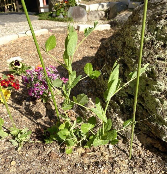 きゃ〜。芽を出し、枝を伸ばし。そろそろ鉢から大地へ植え替えてあげなくちゃ。そのタイミングで支柱を準備したい。父も誘って、あれこれ庭でシュミレーション。