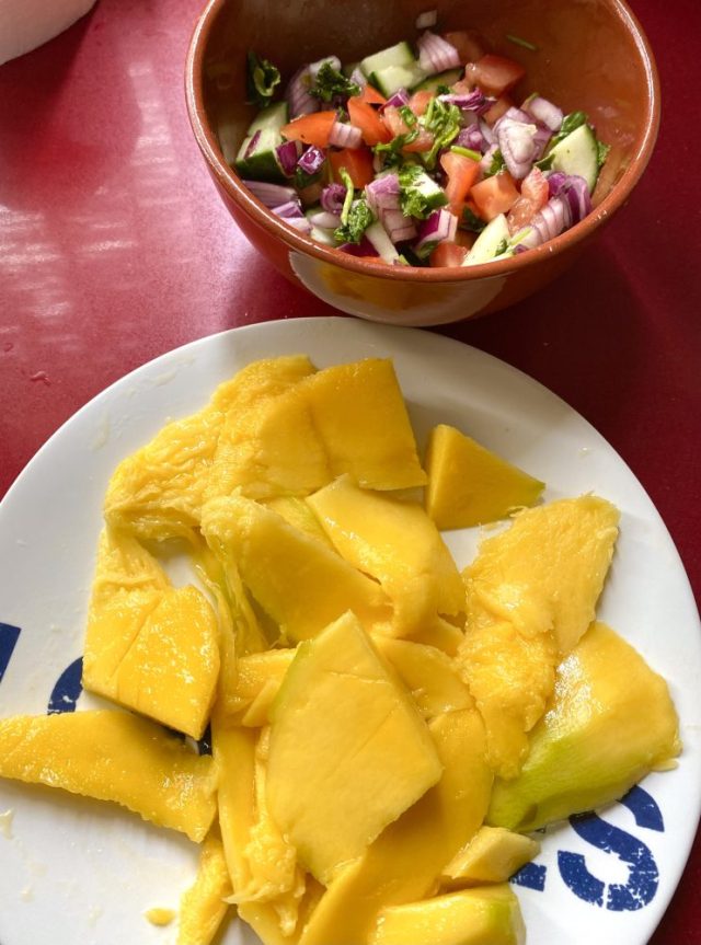 「トマト、紫玉ねぎ、きゅうり、パクチーのサラダ」「デザートにマンゴー」
