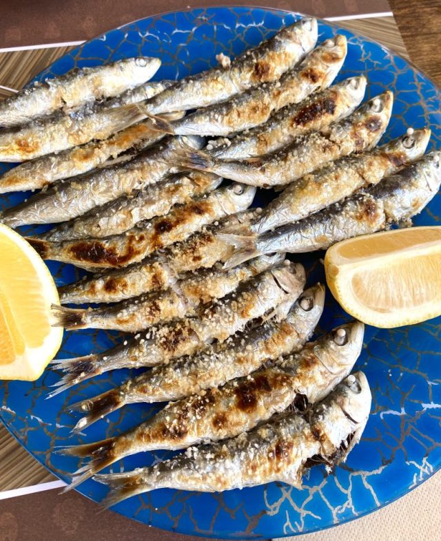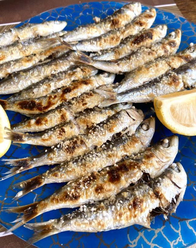 というわけで、急遽女子会に(笑)。すてきなビーチレストランを発見。まずはビールで乾杯。海岸通りといえばイワシ。なんだけど、見てみて。焼きイワシの量がハンパない〜(笑)。