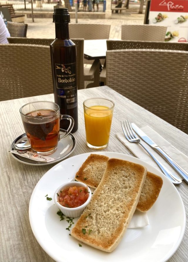紅茶、オレンジジュース、トーストにトマトとオリーブオイルをかけて。これぞスペイン的モーニング。テラス席で、しばし深呼吸。セントロのラリオス通りを歩いていると