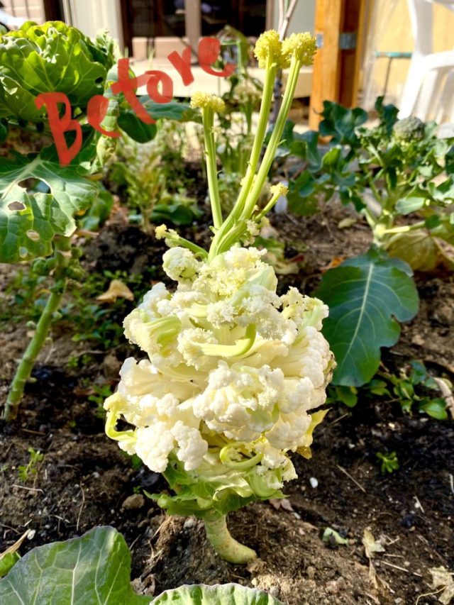 そうそう。先日収穫したカリフラワー。爆発した花のような姿だったので「トウが立って食べられないかなぁ」と思っていたら、