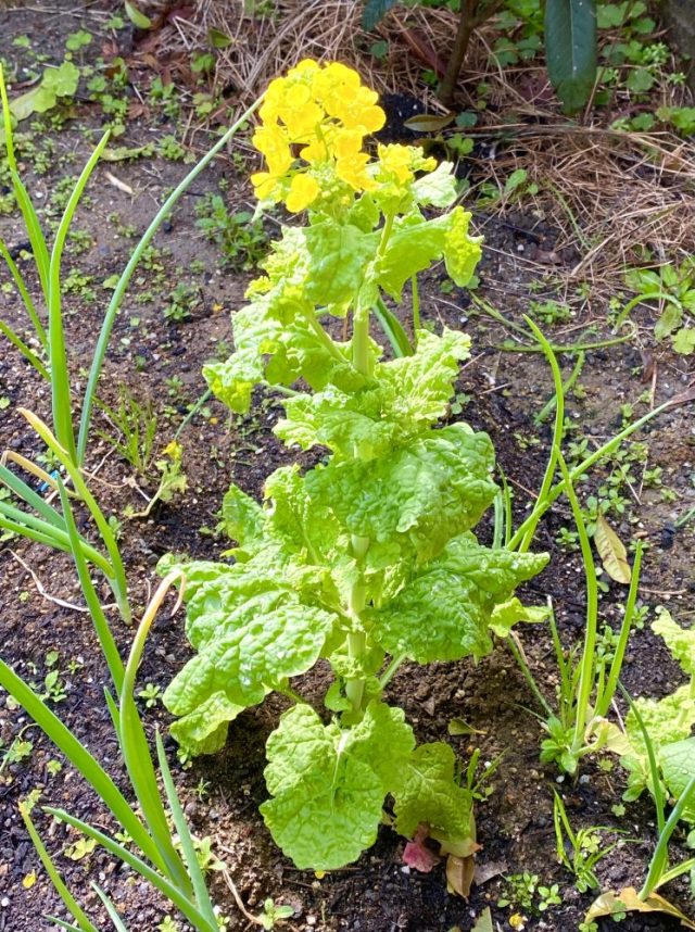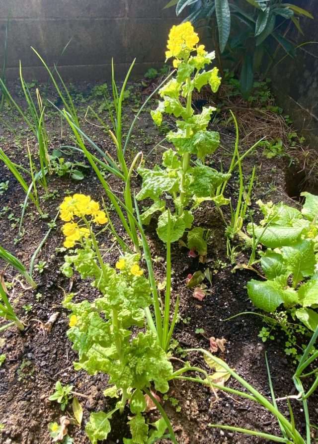 「菜の花、咲いてくれたね」「うちのは遅咲きだなぁ」