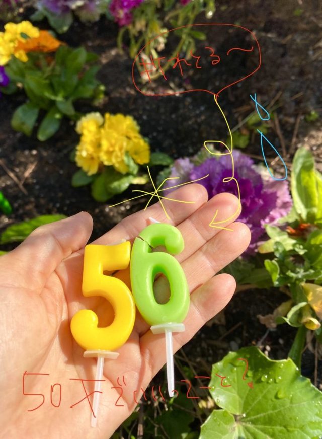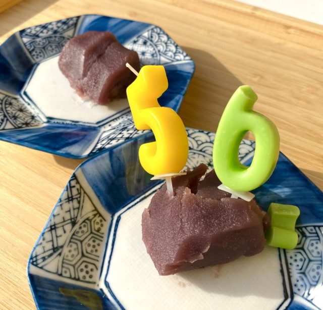 名古屋でお土産に買った「赤福もち」でお祝い。太陽の日差しを浴びながら、のんびり庭カフェ。赤福もちの上に「5」「6」のろうそくを乗せようとしたら