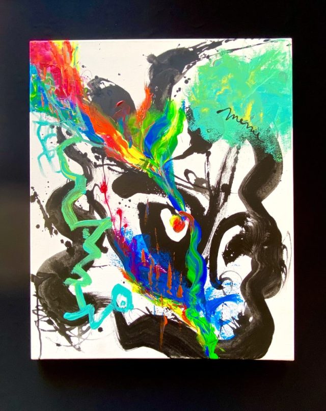 ★作品紹介「我道(ミ・カミノ)」。「道」文字。2022年秋。絶望的な喪失感の中、叩きつけるようにペイント。ミ・カミノ(我道)を切り拓きたいと願う、強烈な思い、内なる叫び、痛みと情熱。