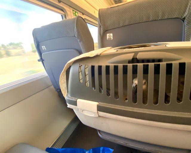 と、写真と動画が送られてきた。「鳥かごはないよ。安心して」ぺぺの言葉に背中を押され、ココを連れて電車に乗る。マドリードまで2時間半、地方行きの特急に乗り換え2時間。さらに、ローカル線に乗り換え、のべ5時間半の旅(写真)。