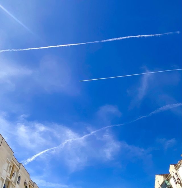帰り道、空を見上げて歩いていたら、ものすごい勢いでケムをまいていた。これをやられると、変な雲が広がるんだよね(写真)。5月のWHO総会を前に、東京池袋では