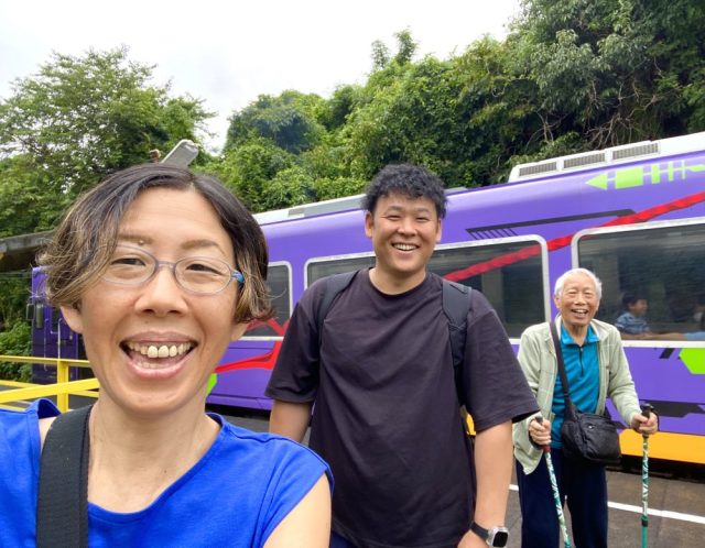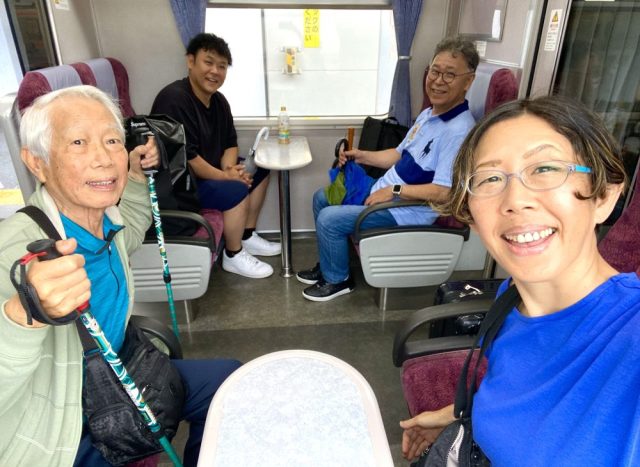 ポールを持った父も、急に勢いよく歩き始める。なんせこれを逃すと、次は1時間後。1時間に1本なのだ〜。なんとしても乗り込まねば。