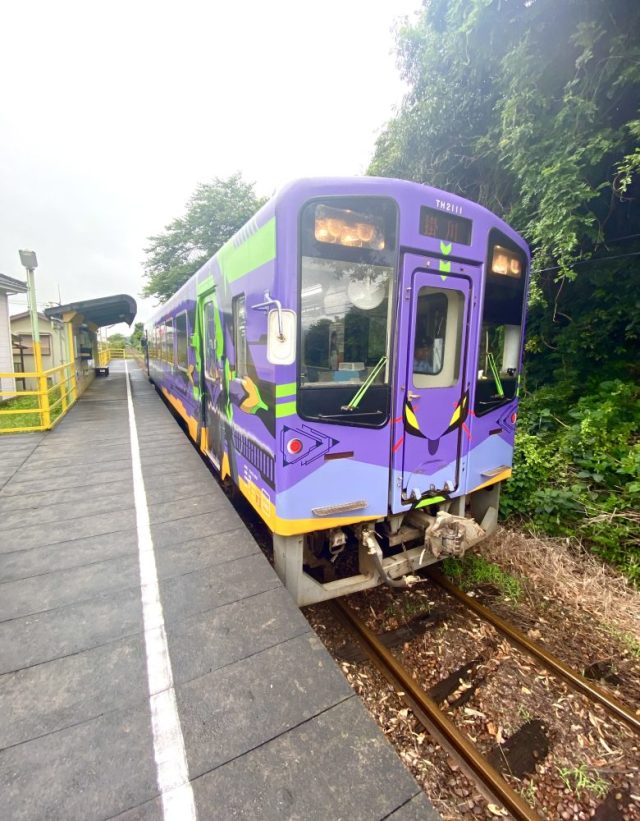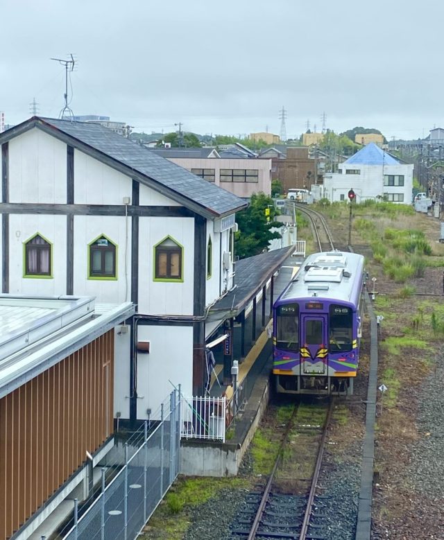大丈夫なのか〜(汗)。いったんJRの改札を出て、天竜浜名湖線の駅まで移動。現金で切符を買わねばならない(カードは使えず)。その時、前方におもちゃのような紫色の列車が。