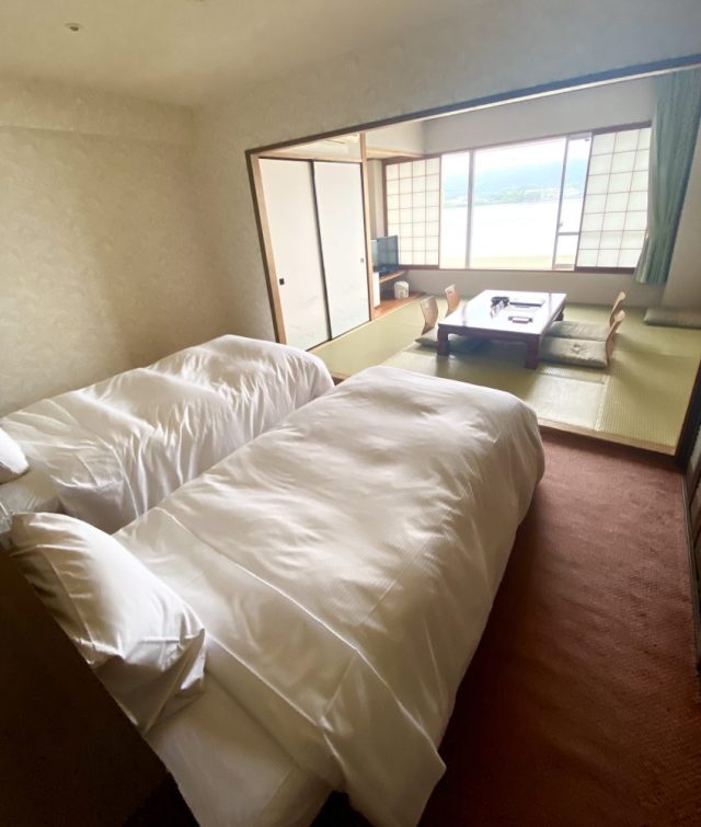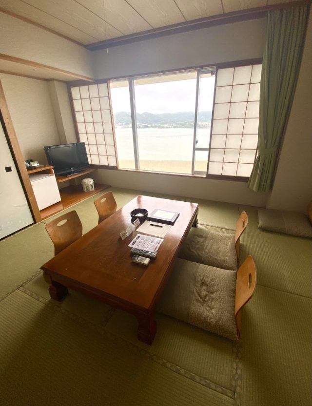 安心感というのか。さて。部屋に入ると、どどーんと浜名湖が広がっている。これっしょ〜。そして、私たちのこだわりポイントは和室。なんせここが、これから行われる