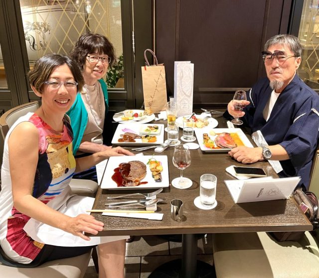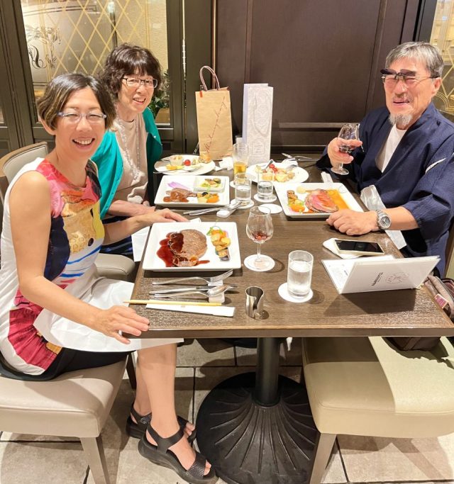 別世界〜(笑)。しばし、ゆったりロビーで涼を取る。本日、ディナーにお誘いくださったのは、伊藤さんご夫妻。私が19歳の頃「就活アルバイト」をさせていただいたご縁で、日本帰国するたび20年以上、杯を重ねている。