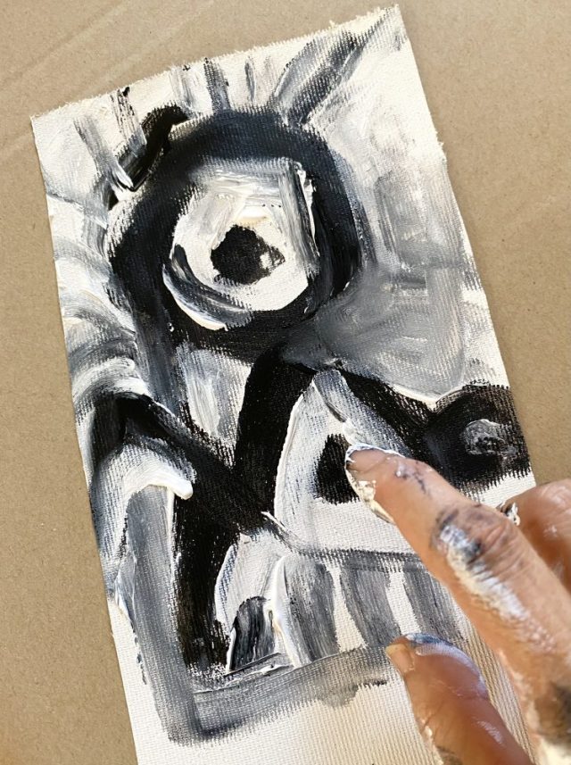 スマホを差し出すも、作品全体が画面ギリギリに収まっているので、細かい部分は何を描いているのかわからない。さらに、画面タッチで大きくすると、全体とのつながりがまるでわからない。全体のバランスを見るためにも、