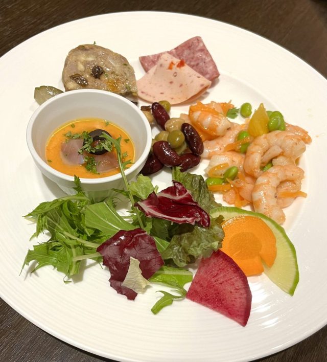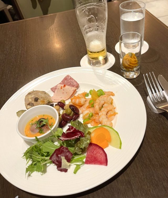 レストランのおすすめステーキ一択(笑)。ここまで来たら、食べるぜ〜。まずは前菜でスタート。これがビールにぴったり(写真)。あっという間にビールを飲み干し、前菜を丸々皿に残したまま、
