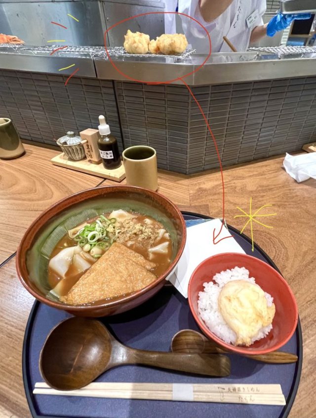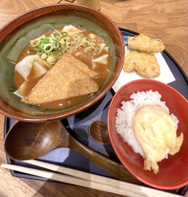 で、駆け込んだうどん屋(きしめん屋?)。あげ入りみそきしめん、鳥天、卵ご飯のセット。おいしい〜。本当は画材屋に寄りたかったのだけど、