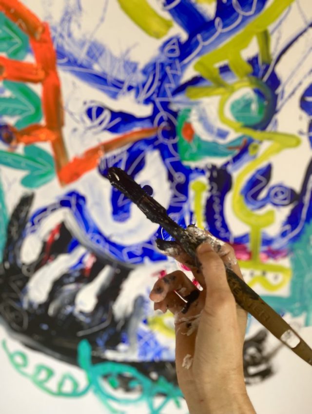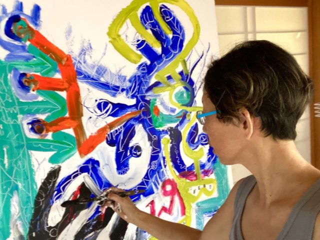 立って動いて、全身で描きたい〜。この中画(180×90センチ)は、ほんとペイントしやすい。絵の具を乾かしながら、4作を同時進行。ずらりと4枚を壁に並べて。さらに今週から、