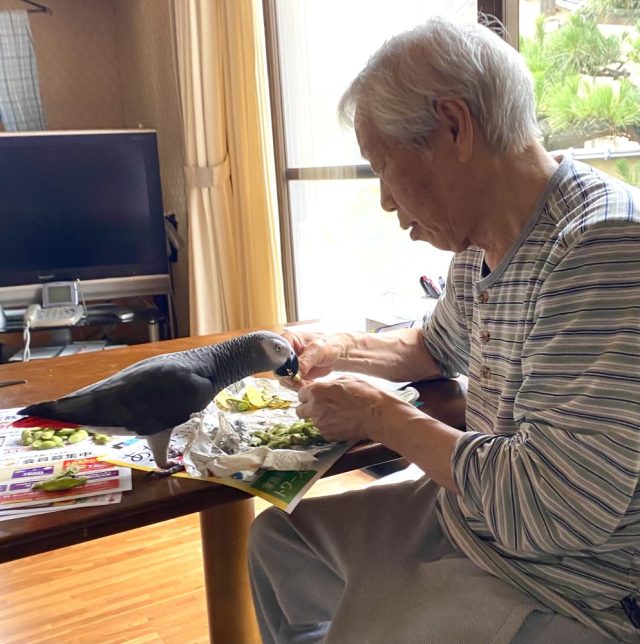 父とココが、なにやらテーブルで作業中(遊んでる?)。私が2階で引きこもり制作中、父にココを任せて。思いがけず「オウムの世話」が、父のルーティンに加わる。