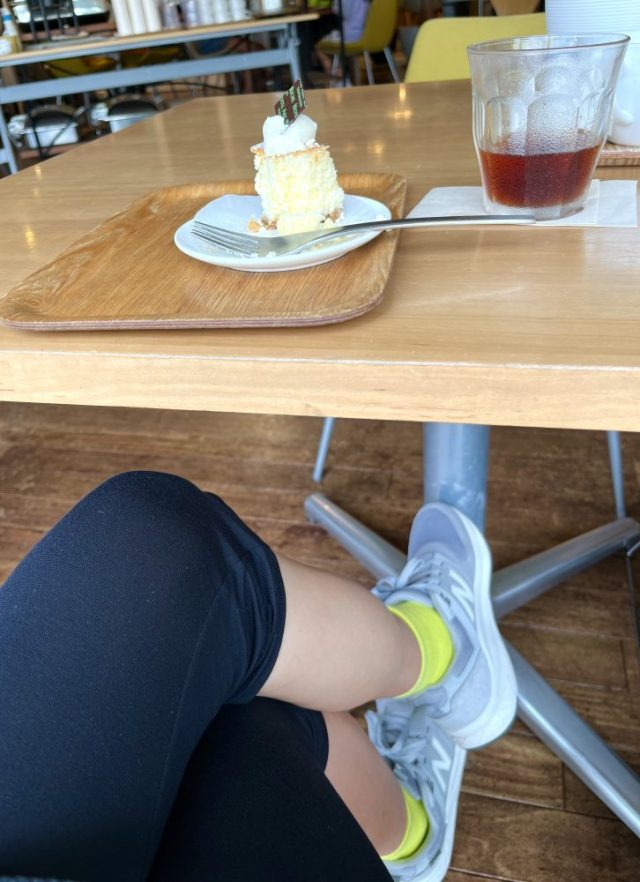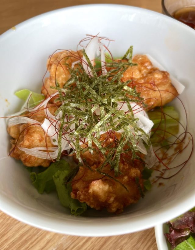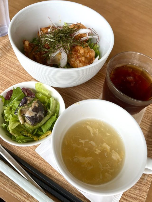さて。テニス教室の帰りは、お待ちかねのランチ。鳥の唐揚げ丼のランチセットは、チーズケーキ付き。さらに、バッグの中に忍ばせている