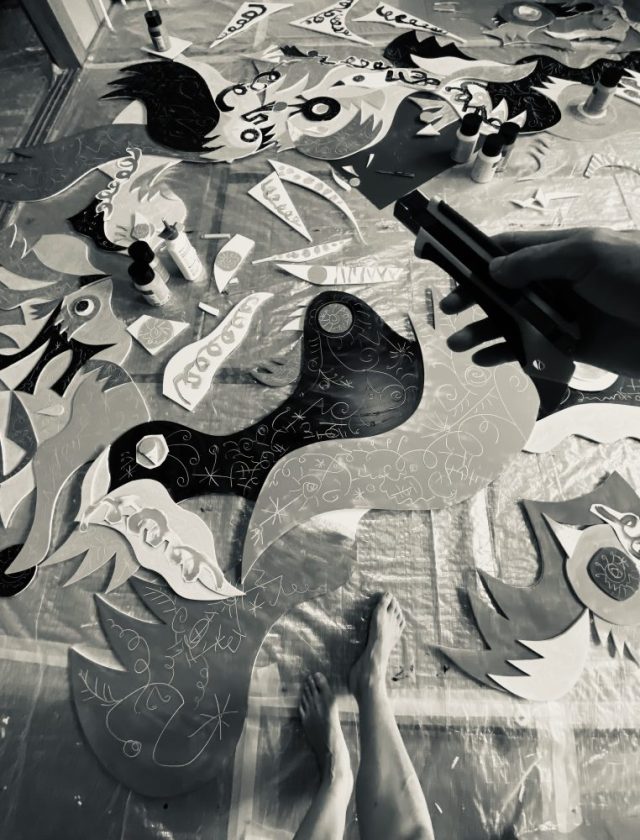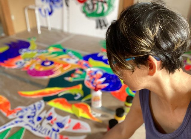 階段での行き来はあるものの、絵の具を乾かせてちょうどいい。5時間ほどペイント。なんとか1週間で完成させたい。明日は豊橋市主催の