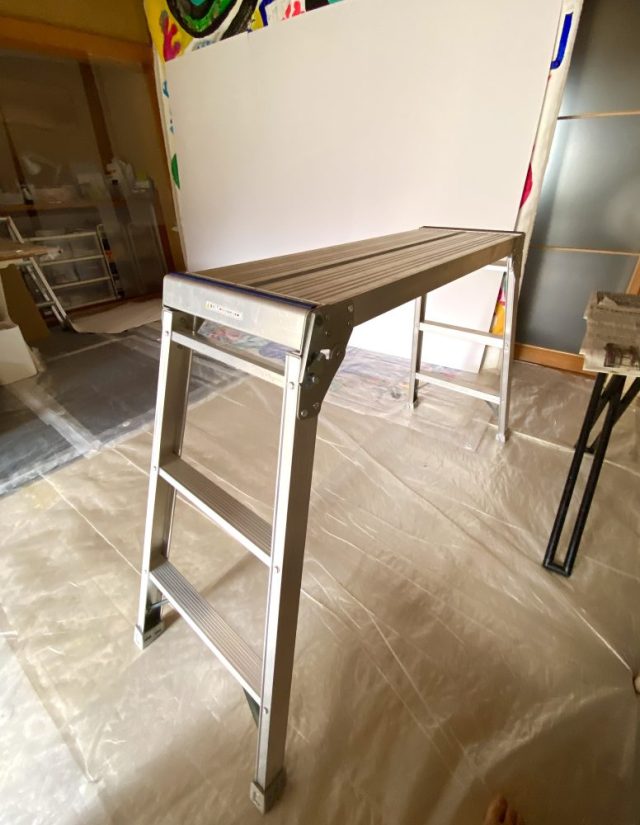 大画ペイントを再開。これさえあれば、横移動も可能。折りたたみ式で軽いので、持ち運びも簡単。実は父からのプレゼント。もしや、家の中に足場を組まれないように?(笑)