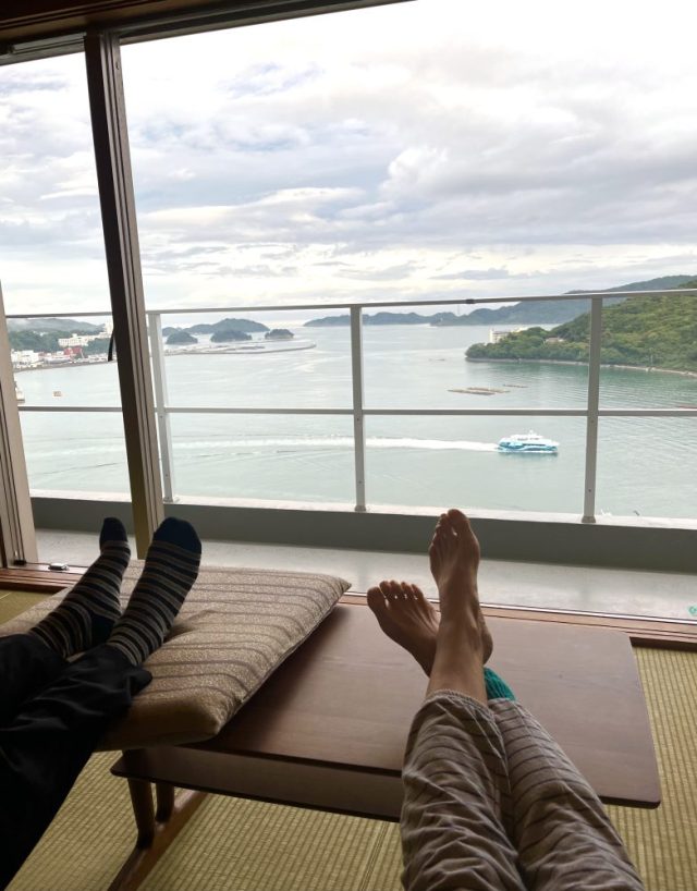 父がぽつり。その横で、私はちゃちゃっとブログを入力。今日は鳥羽から伊勢へ。バスと電車を乗り継いで移動するはずが、レセプションで確認したら、