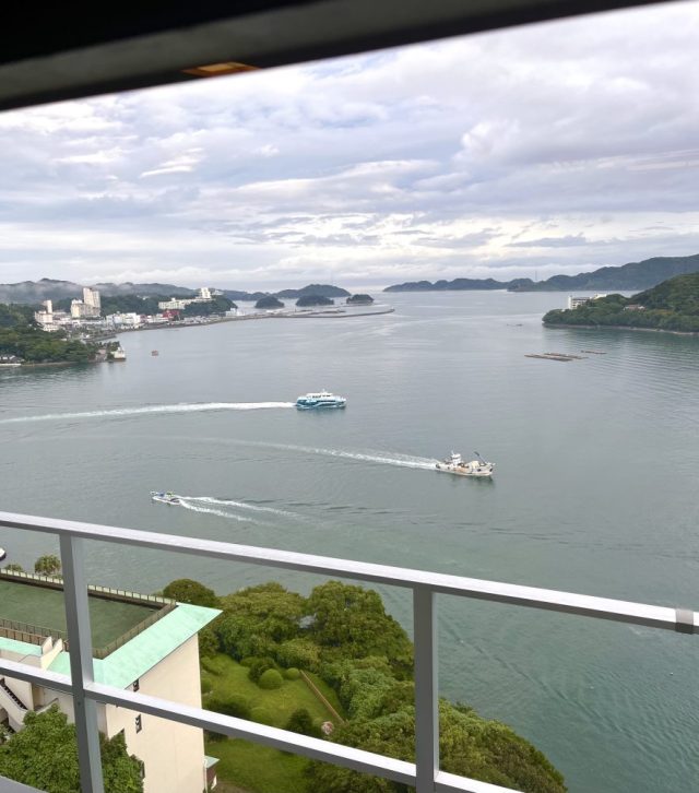 なんと!座っていればいいなんて。これなら父も安心。朝風呂、朝食バイキングの後は、いざ伊勢に向かって出発。45分のバスの旅。鳥羽方面は緑が多い。海や山を眺めていたら、