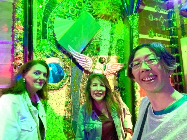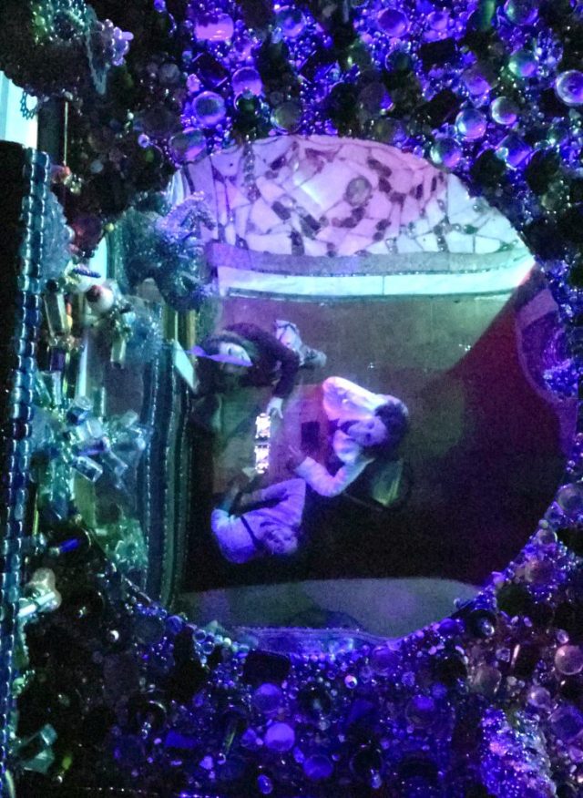 2人の案内で、ガラスの城へ。光に当たるとキラキラと控えめに光を放つ。まるで深い海の底にいるような。不思議な世界。見上げれば、天井には丸い鏡が。月のように浮かんでいる。