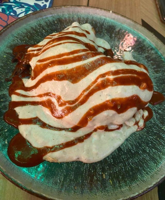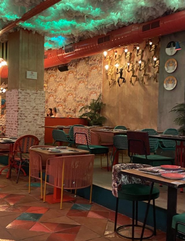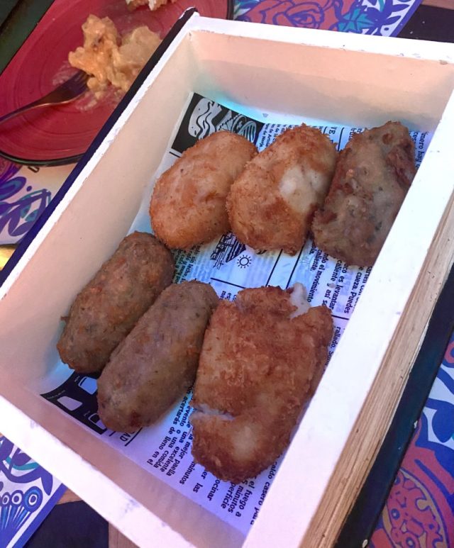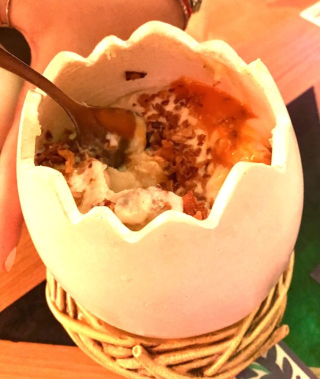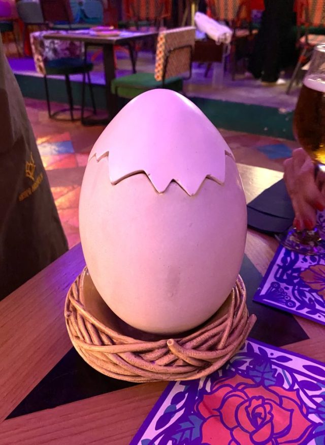 入ってびっくり。内装も、メニューも、盛り付けもおもしろい〜。大きな卵型の器に盛られたポテト料理。ピカソの本かと思いきや、フタを開けたらコロッケ。