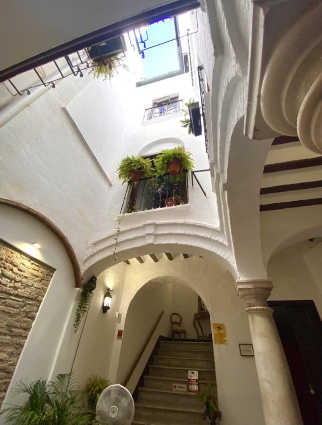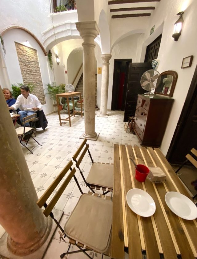 プライベートな楽園、オアシス。これぞ、アンダルシアの生活空間、建築様式。オーレ!馬蹄形のアーチを描く円柱、白壁、床のタイル。天を見上げれば青い空が。無機質なモダンデザインのお店が増える中、