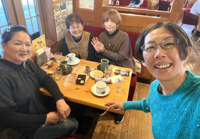 勢いよくほおばりつつ、1年分の近況報告。澄子先輩はアート活動に奔走、ひとみさんはしっかり家庭を守りつつピアノに挑戦、アメリカから帰国中のようこさんは、日米の政府相手に手続きを進行中。