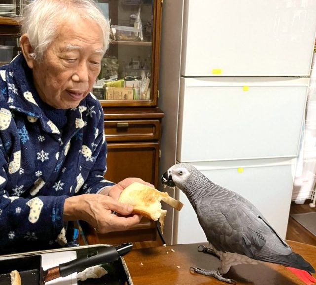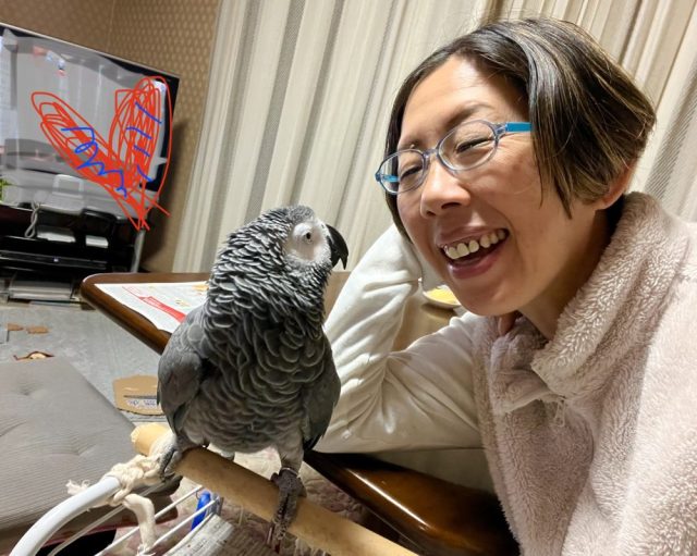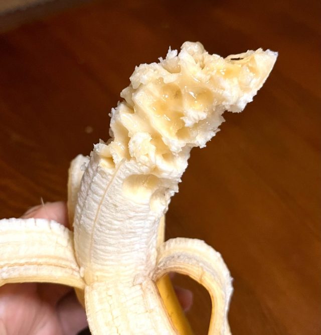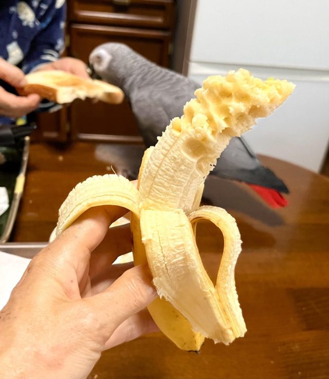 さて。1階のキッチンでは、父がオウムとおやつのバナナを食べていた。勢いよく喰らいつくので、ぼこぼこに(写真)。一瞬、彫刻に見えた(笑)こういうアート?