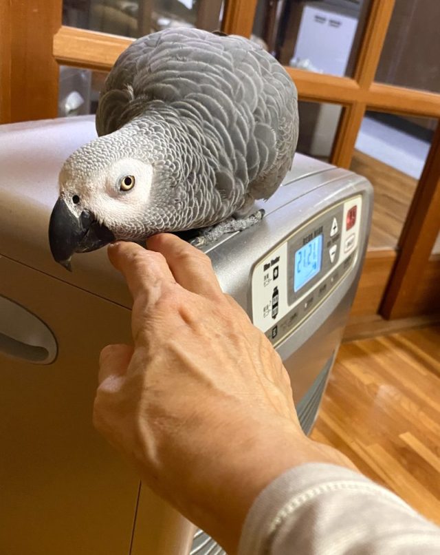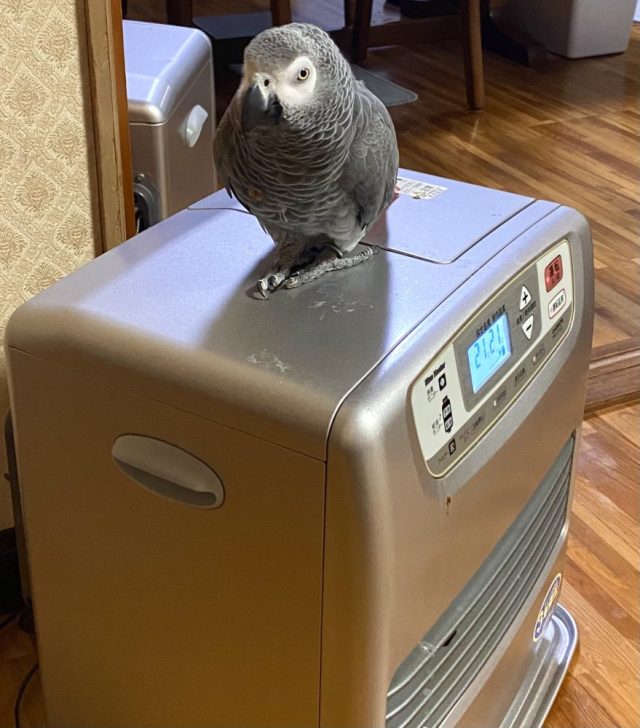 すっかり寒くなり、うちではファンヒーターが大活躍。なぜかオウムのお気に入り場所に(写真)。行きつけなん?(笑)。ふと見ると、丸くなってくつろいでいる。